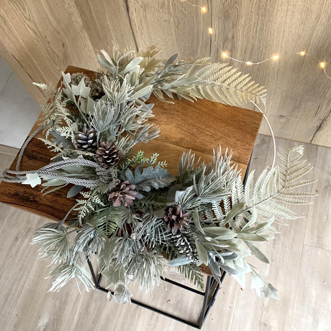 Wianek świąteczny w stylu hygge wypleciony na obręczy z gałązek sztucznego świerku, liści paprotki różnego gatunku, liści starca, jasnego bluszczu oraz dodatkowych małych listków. Uroku wiankowi dodają naturalne szyszki oraz srebrne, zwisające sznurki.