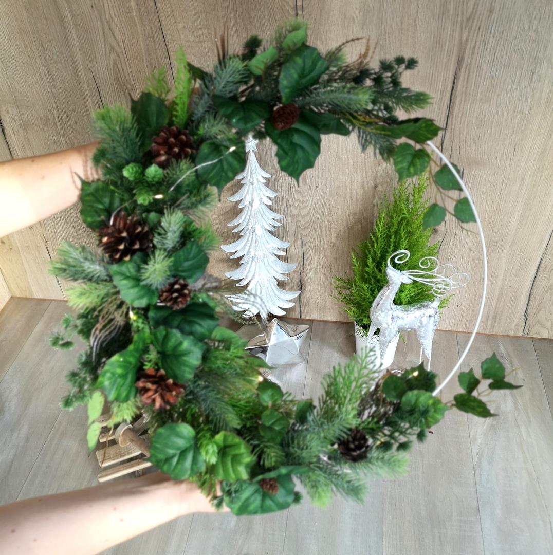 Obręcz z zielenią świąteczną będzie nietuzinkową dekoracją do której można dołączyć dodatki w kolorystyce znajdującej się we wnętrzu. Dekoracja z zieleni doskonale będzie prezentowała się na ścianie bądź zawieszona na wystawie bądź w oknie.
