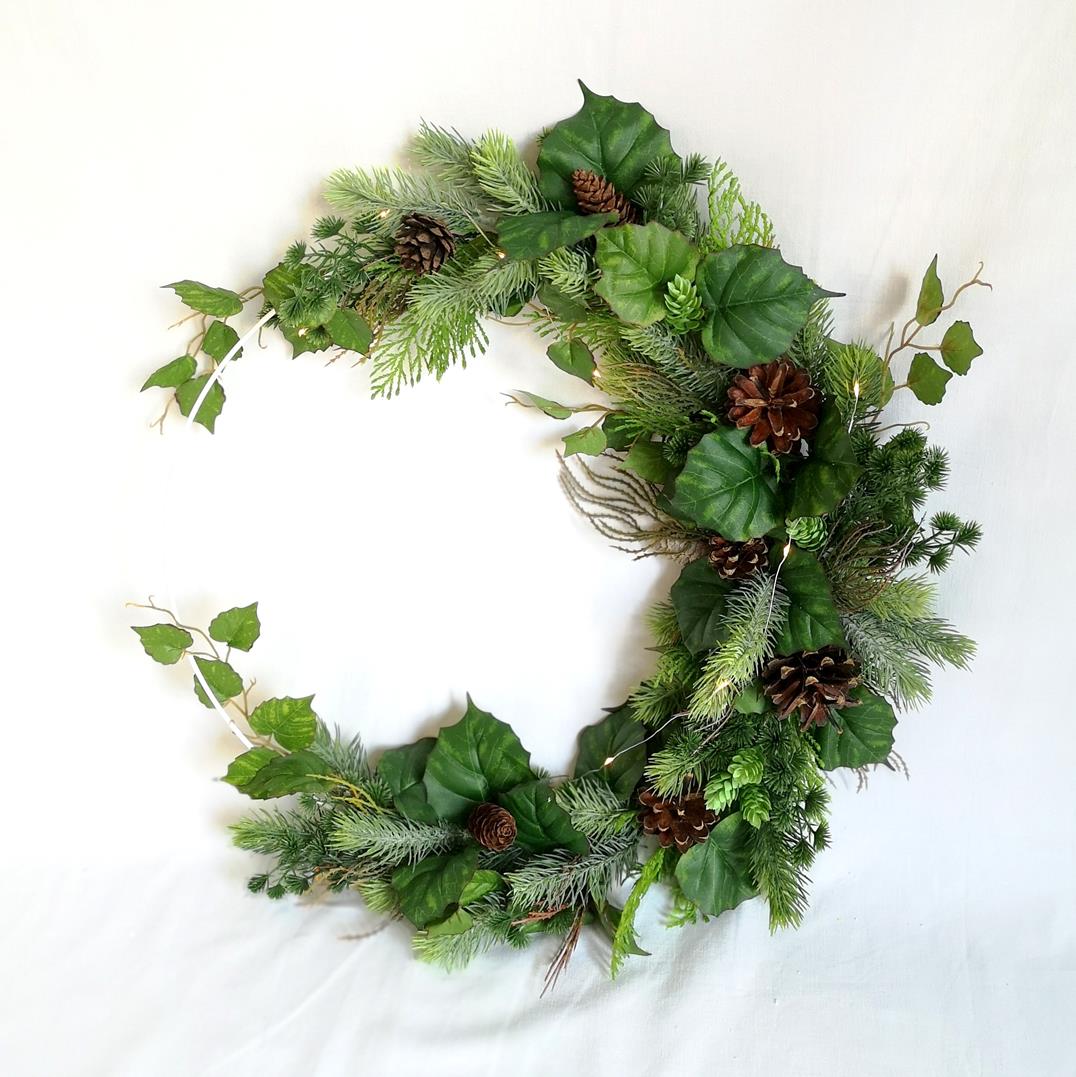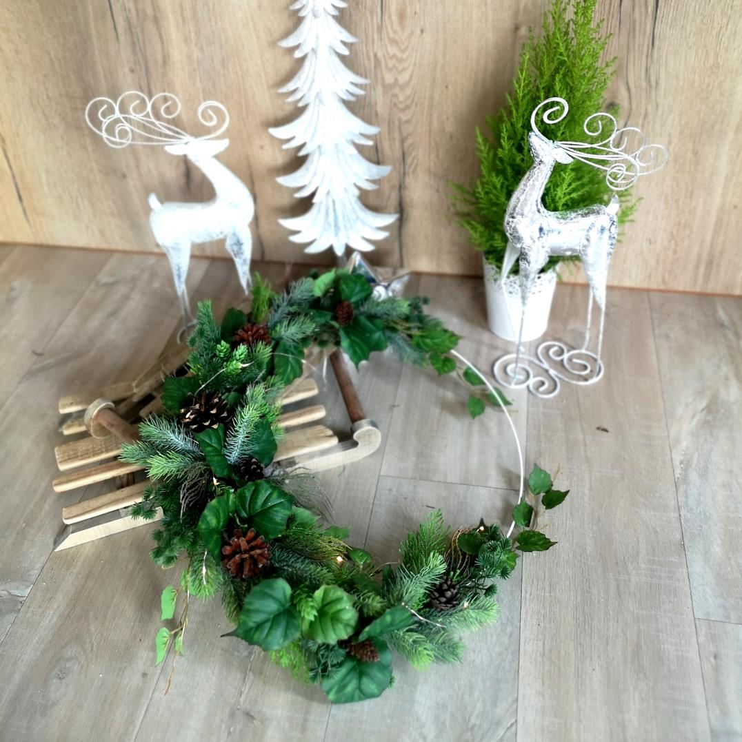 - nowoczesny wieniec świąteczny można owinąć lampkami led dzięki czemu cudownie doświetli pomieszczenie i nada mu świątecznego klimatu,